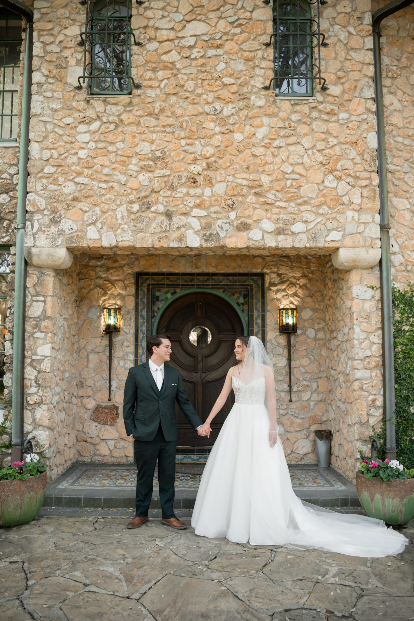 Bride and groom portraits in front of the historic stone building at The Veranda wedding venue in San Antonio photographed by Bushel + Peck Photo.
